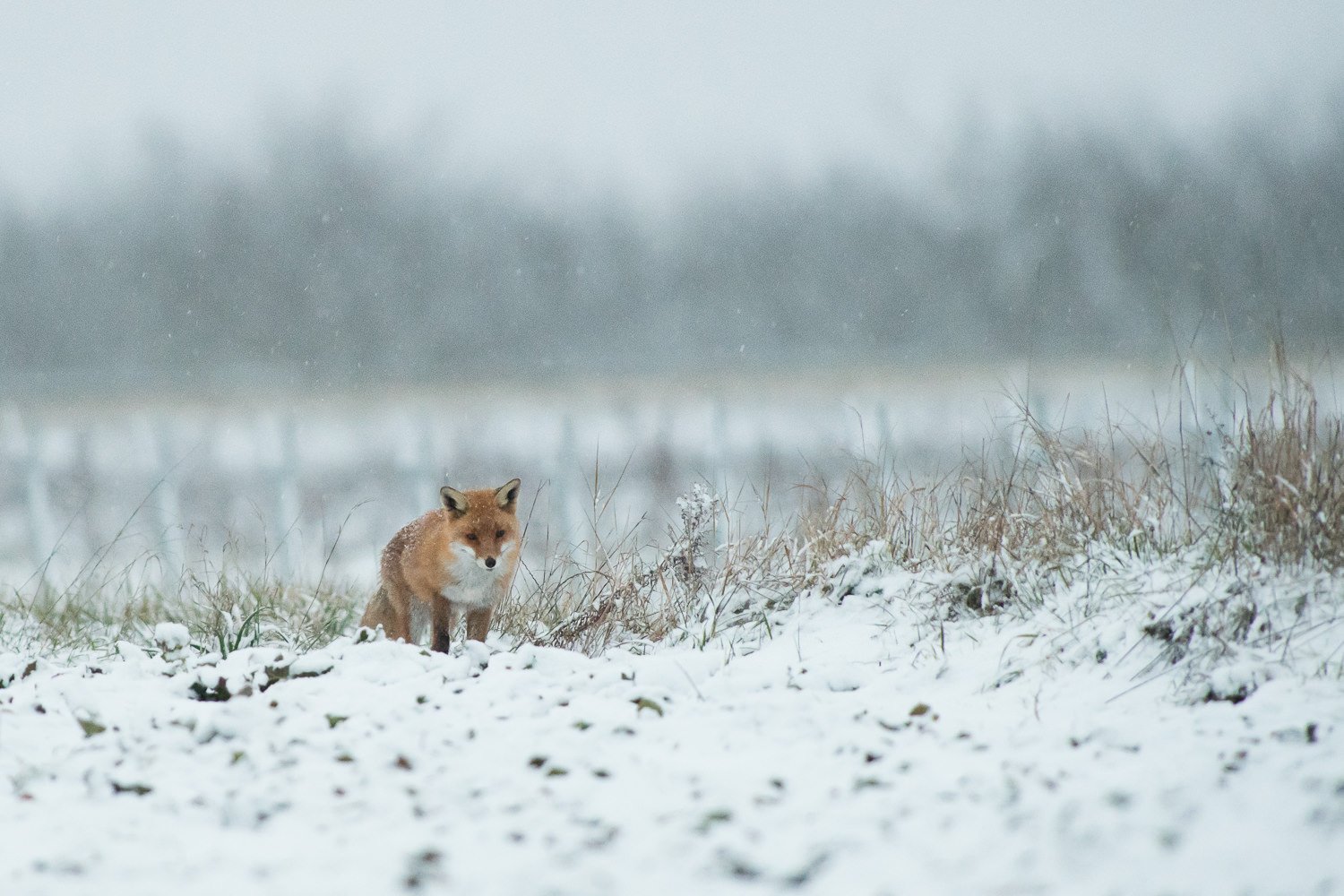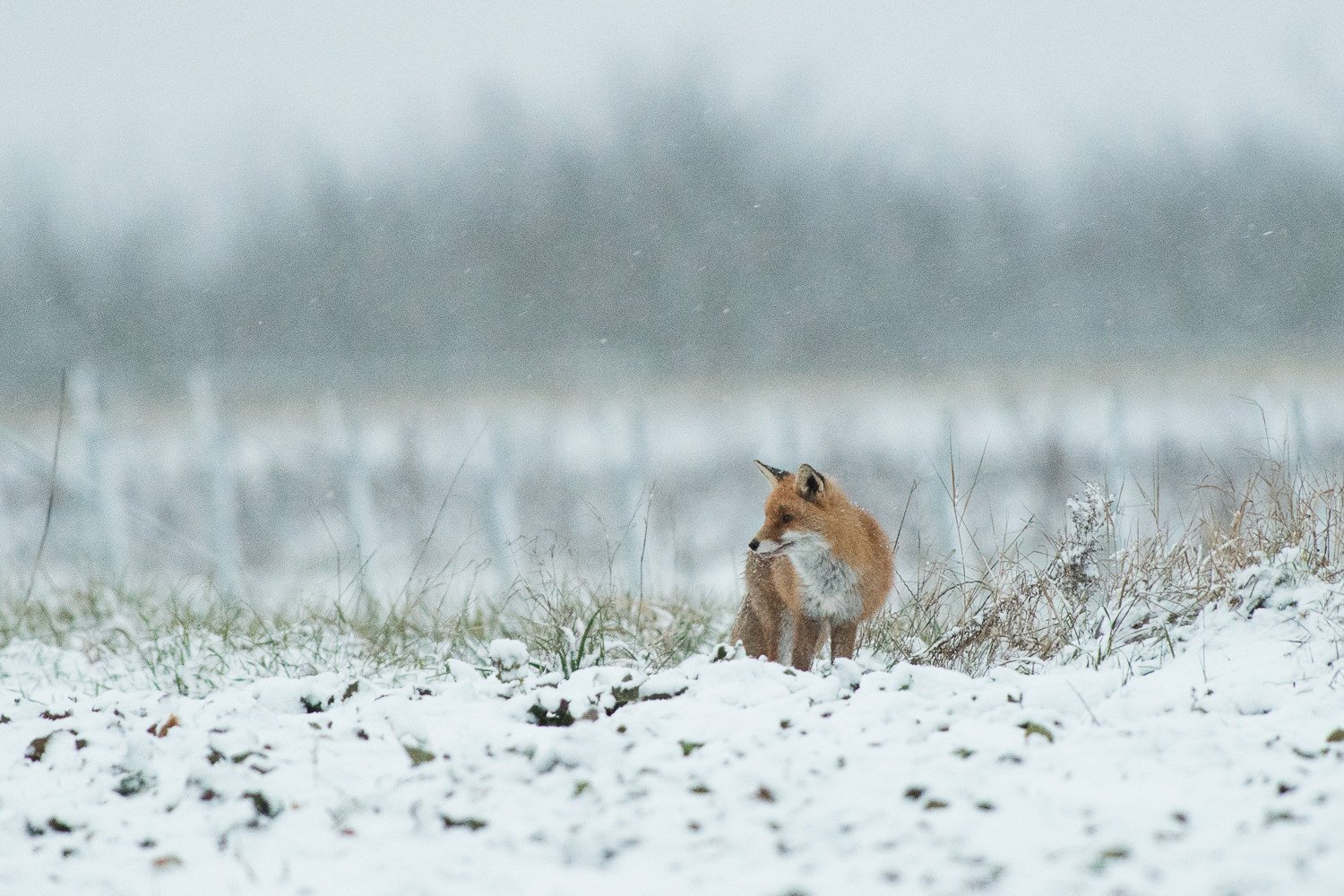 Après l’avoir vu plusieurs jours de suite déambuler dans ce secteur, j’ai enfin pu immortaliser son cheminement. Juste après la tempête de neige, il est déjà 9 h, je m’apprête à quitter mon affût. Les jours précédents mon ami goupil était déjà rentré dans la forêt à cette heure avancée de la matinée. À peine relevé, j’aperçois sa silhouette entre les rangs de vigne. Je me repositionne lentement avec une certaine appréhension d’être repéré. Depuis 2013, je n’avais pas fait de belles photos de renards dans la neige! L’émotion me gagne à son approche, le viseur se couvre de buée, c’est la panique ! Je retrouve mon sang-froid, m’éloigne un peu du viseur, la buée s’en va, le meilleur moment atteint son apogée lorsque maître goupil passe à 10 m de moi sans me repérer. Quelle rencontre !