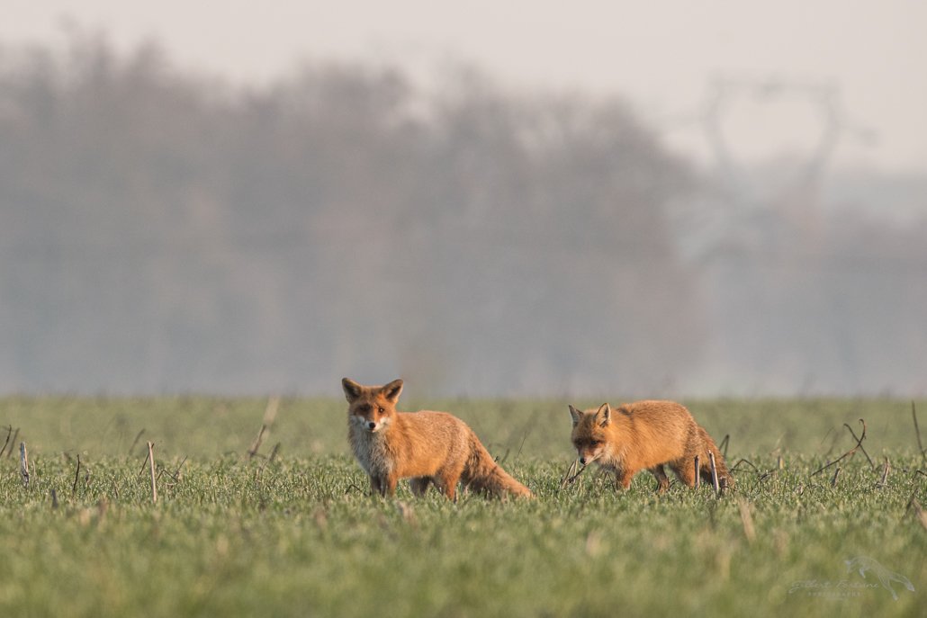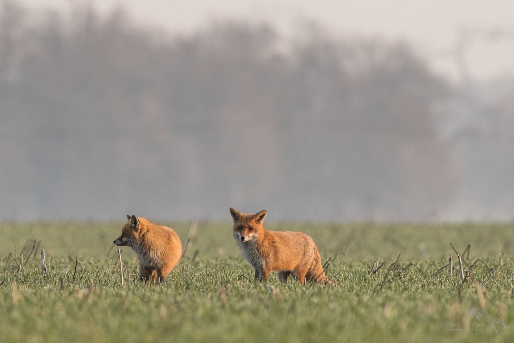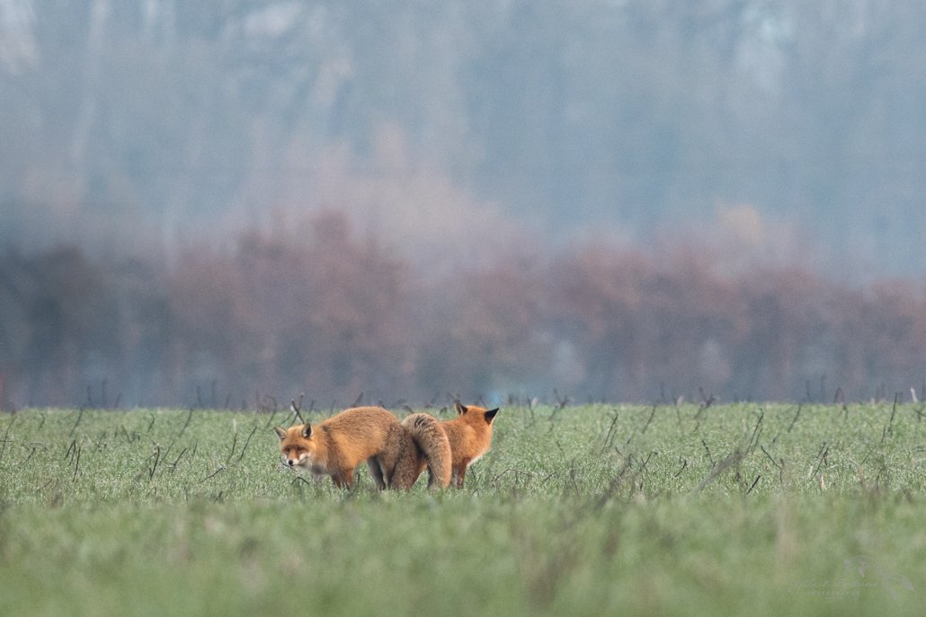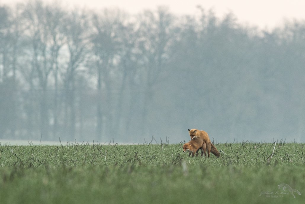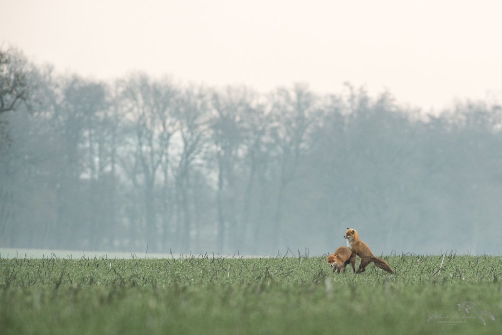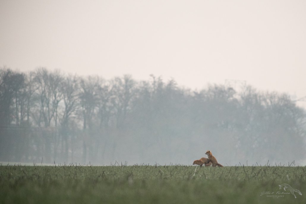 Il est bientôt 8h et le jour commence à se lever. Quelques chevreuils passent devant mon affût mais la lumière est encore trop faible en lisière de forêt. Un quart d’heure plus tard, Je m’impatiente un peu car la probabilité de voir des renards s’amenuise. Cependant la chance peux sourire à force de persévérence. En effet, quelle ne fut pas ma surprise en voyant arriver ces 2 tourtereaux à l’horizon. Ils se suivaient tranquillement !!  Je ne raconterais pas la suite, les photos parlent d’elles-mêmes!! Les ébats amoureux ont quand même duré près de 35 mn!